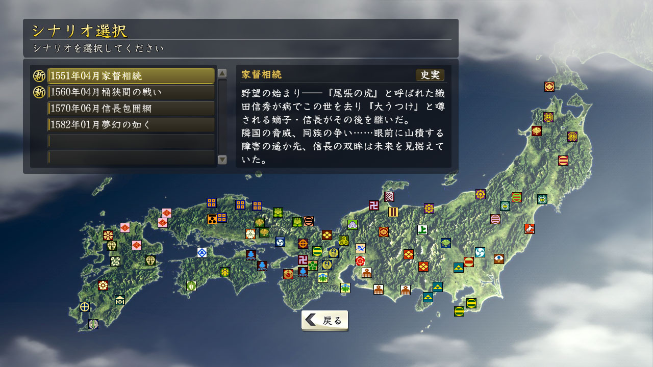 準備了戰國時代各種局面的劇本。可在全國各地割據的群雄中,選擇喜歡的大名。每個劇本的開始年份都不同,天下的情勢跟登場武將也會有變化。