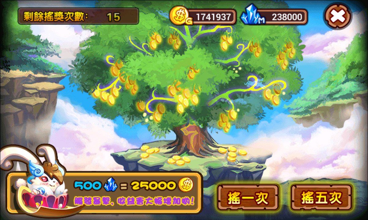 兌換商店中將加入搖錢樹,玩家可以使用搖錢樹功能將M幣兌換成G幣,每500M幣即可兌換25000G幣,而且在搖的過程中還能收穫意外驚喜,暴擊可以獲得雙倍的G幣收入喔!