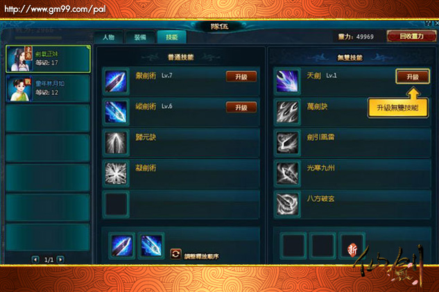 在山神廟,酒劍仙除了收下李逍遙為徒外,還教會角色新技能「無雙技能」。玩家進入技能面板學習、升級或裝備無雙技能。在戰鬥時,玩家點擊裝備的無雙技能後,在螢幕的提示下按下相對的字母鍵,將可大大提升無雙技能的效果。