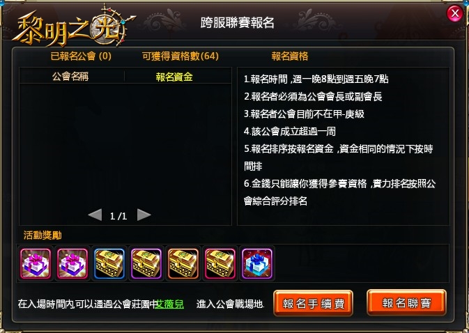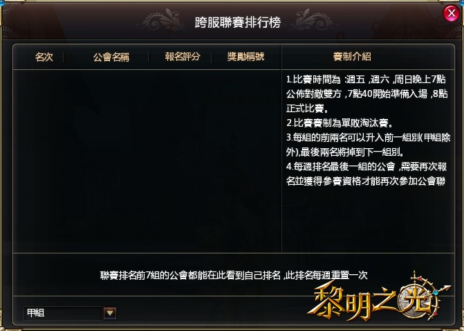 公會聯賽在每週的五、六、日晚上八點開戰,選出各等級的頂尖公會。在各級小組戰中成績優異的公會,不只可以獲得豐富的獎勵,還可以在原有的等級中晉級,下週再參賽時就可以和更強的對手一較高下。