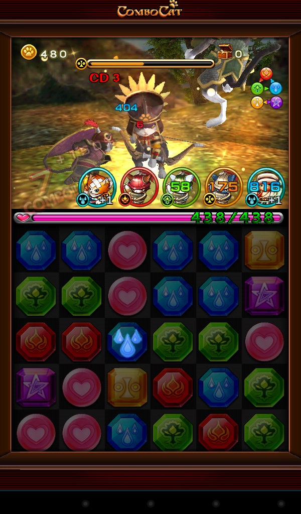 如果一次消除 5 個以上的寶石則能掉落一個強化的符石提高玩家該屬隊員的攻擊力。