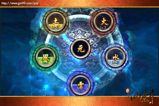 在《新仙劍》中需要充沛的靈力方可藉助五靈輪提升主角的綜合戰鬥質素,玩家進入五靈輪介面後將會看到蘊含土、火、水、雷、風五大元氣屬性,其中土代表主角防禦資質、火代表主角攻擊資質、水影響主角生命資質、雷影響每回合獲得怒氣值,最後的風表示主角減傷率。