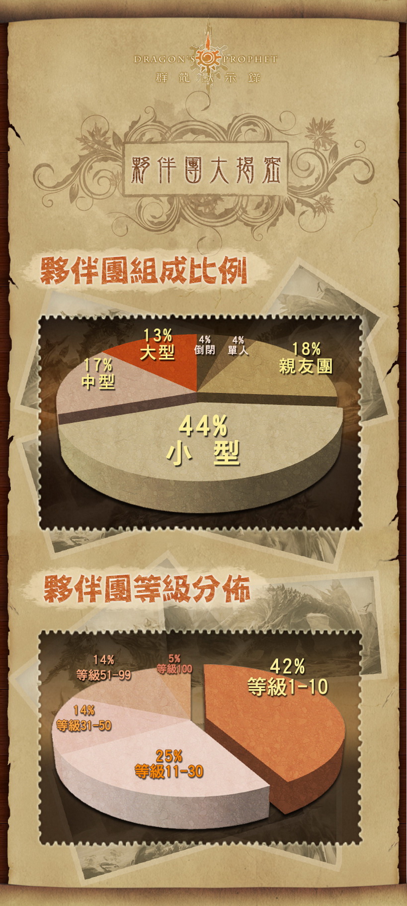 群龍默示錄》夥伴團的大多是中小型夥伴團或十人以下親友團,佔夥伴團組成的80%,如同台灣中小企業的佔整體企業比重相當高。此外,活躍人數、上線率,中小型夥伴團與親友團都有相當好的表現,也與台灣現況不謀而合。