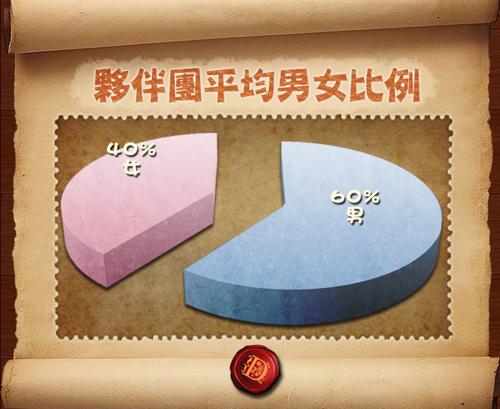 根據群龍夥伴團「人口大普查」結果,夥伴團的女性比例是40%,遠高於其他遊戲平均的10~20%,但大型夥伴團女玩家比例相當低,反倒是中小型夥伴團女玩家頗高,其中由女玩家組成的夥伴團,遊戲中更超過70個!這些全女性夥伴團,幾乎都是10人內的親友團,看來要享受女生環繞的夥伴團生活,可得鎖定親友團加入!?