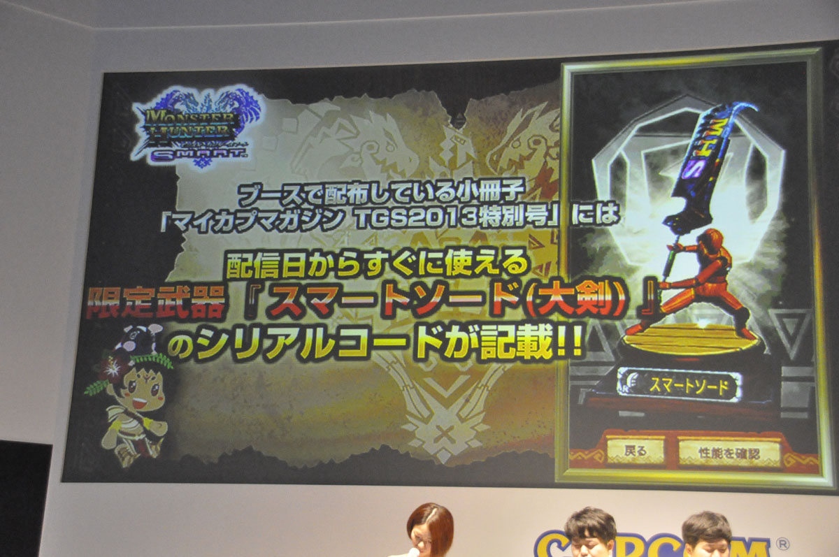 在 TGS 2013遊玩《魔物獵人 Smart 》可獲得獨創的擦拭布及貼紙,還有限定武器「智慧型大槌(スマートハンマー)」作為禮物