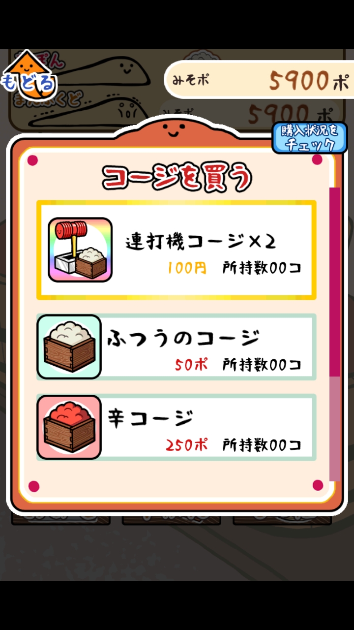 理論上光靠拍打味噌碰來進行熟成並不是不可能的事,只是玩家的手指可能會先抽筋就是了。為此遊戲設計了需付費購買的道具「連打機麴」-在這項道具的作用期間,玩家只要按著螢幕便可獲得高橋名人般的連打速度啊!