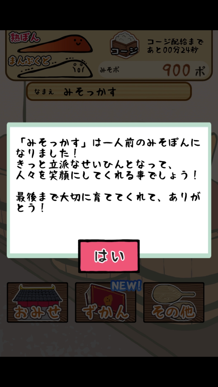 當玩家將味噌碰養育到完熟狀態-也就是最高階時-味噌碰還會贈予特別的麴來感謝玩家的養育之恩。至於餵食甚麼麴會養出甚麼樣的味噌碰,這件事筆者也說不準,就留待玩家自行發掘。