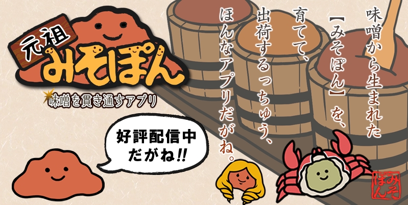 元祖味噌碰(暫譯,日文原名:元祖みそぽん~味噌を貫き通すアプリ~)》是一款以養育味噌碰為主題的養成遊戲,在本作中,玩家的目標便是要親手「拉拔」味噌碰長大、並將味噌碰加工成為各式各樣的產品。