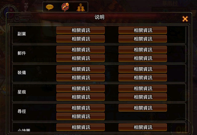 遊戲內增加新手資訊查詢系統,方便新進入的玩家儘快上手遊戲,踏入征程。只要點擊遊戲介面中右上角的「?」圖案,再在彈出的介面中選擇「說明」,即可打開新手指引。新手指引里包含大部份副本資料,還能查詢到VIP、副業、郵件、裝備、星痕、技能等資料,對武士的成長非常有幫助。