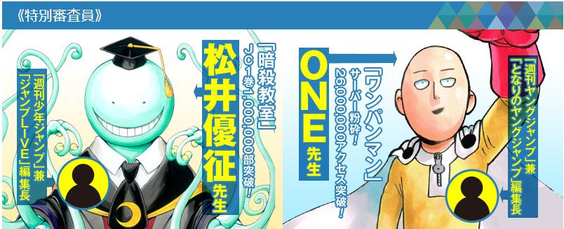 這次「JUMP 次世代漫畫獎」也邀集了特別評審,包括漫畫《暗殺教室》的作者松井優征及漫畫《一拳超人》的作者 ONE。只要在這次漫畫獎中被選上佳作以上的作品即可獲得保證連載權,最大獎更是有 100 萬日圓的豐厚獎金。且不論郵寄或電子信件皆可投稿作品,至於詳細參加辦法可參閱官網資訊。