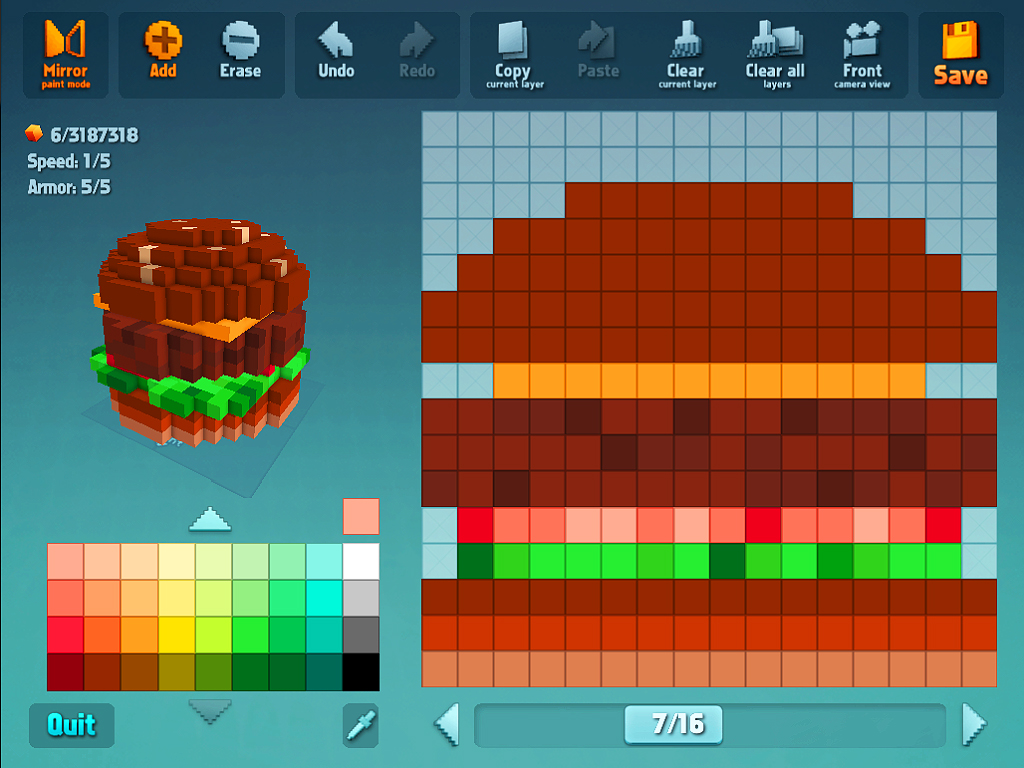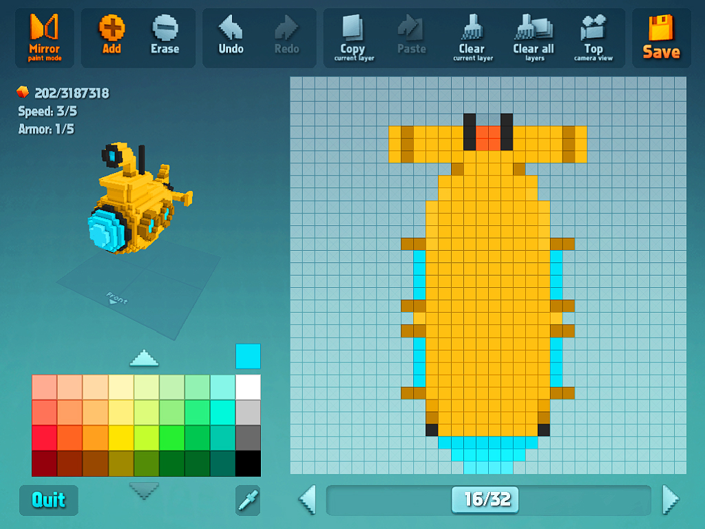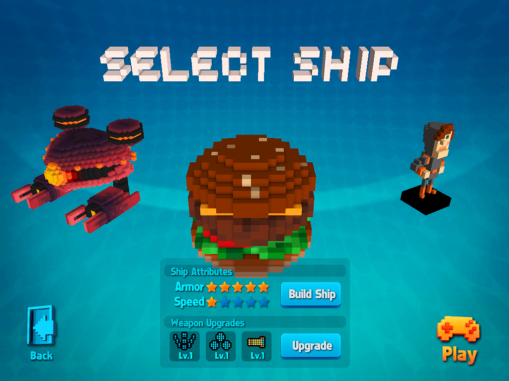 在創造太空船部分,玩家在 iPad 上可以創造 16x16 或是 32x32 的太空船,而在iPhone 上因為螢幕大小的關係,只能創造 16x16 的太空船。