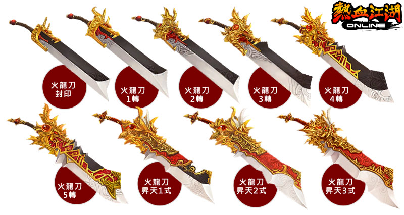」,也因為「韓飛官」的出現而現身了! 曾經是邪派至尊 - 天魔神君所用武器,威力強大,能夠毀天滅地。不少江湖人士為了此刀而喪命,不過如同漫畫中的情節,火龍刀在遊戲中也是認主人的,只有創立「韓飛官」角色,才有擁有自己火龍刀的資格,而這把刀的外觀也會隨著「韓飛官」證明自己的實力後,外觀上逐漸成長進化,玩家們趕緊將自己的火龍刀晉升到最強階段叱吒江湖吧!