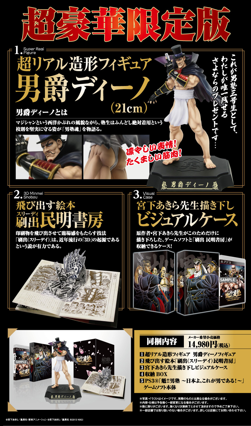 魁!!男塾 日本啊、這才是男子漢!》預定 2014 年 2 月 24 日推出一般版與超豪華限定版。限定版中將包含男塾三號生男爵迪諾(ディーノ)的超寫實造型人偶模型(高 21 公分)、立體繪本「刷出民明書房」、宮下亞喜羅繪製彩繪收納封套、收納盒與遊戲軟體,價格 14980 日圓。