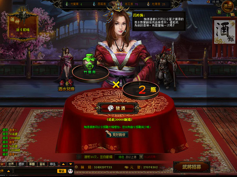 射箭完成後,呂布的女兒呂玲綺出現,願意與玩家賭酒。玩家可以選擇賭酒或者見好就收。如果賭酒成功,不僅獲得的酒會大幅增加,而且呂玲綺還會脫掉她的衣服哦…..