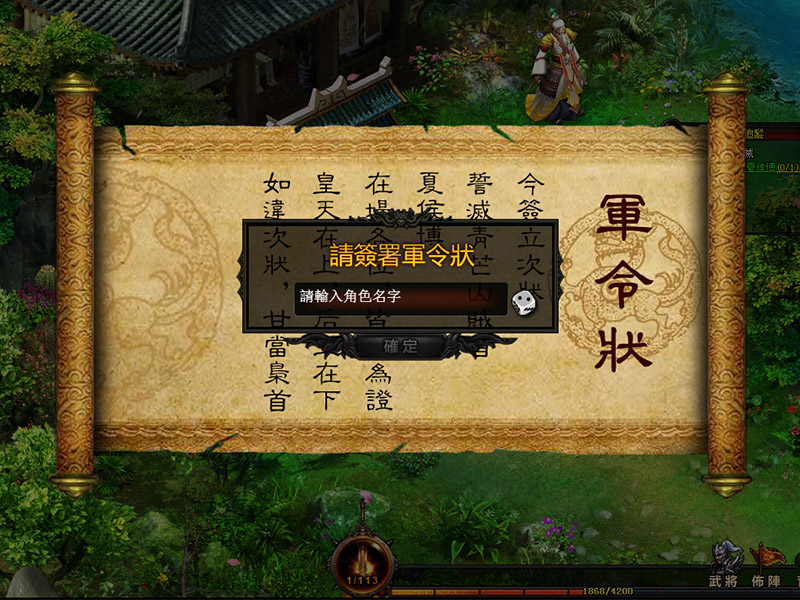 角色達 5 級後便可進入主城,同時將會與益州牧劉焉簽訂一張軍令狀,從此軍令狀系統會伴隨玩家終生,且將是玩家的好幫手,遊戲過程中將會提供重要的訊息指引。