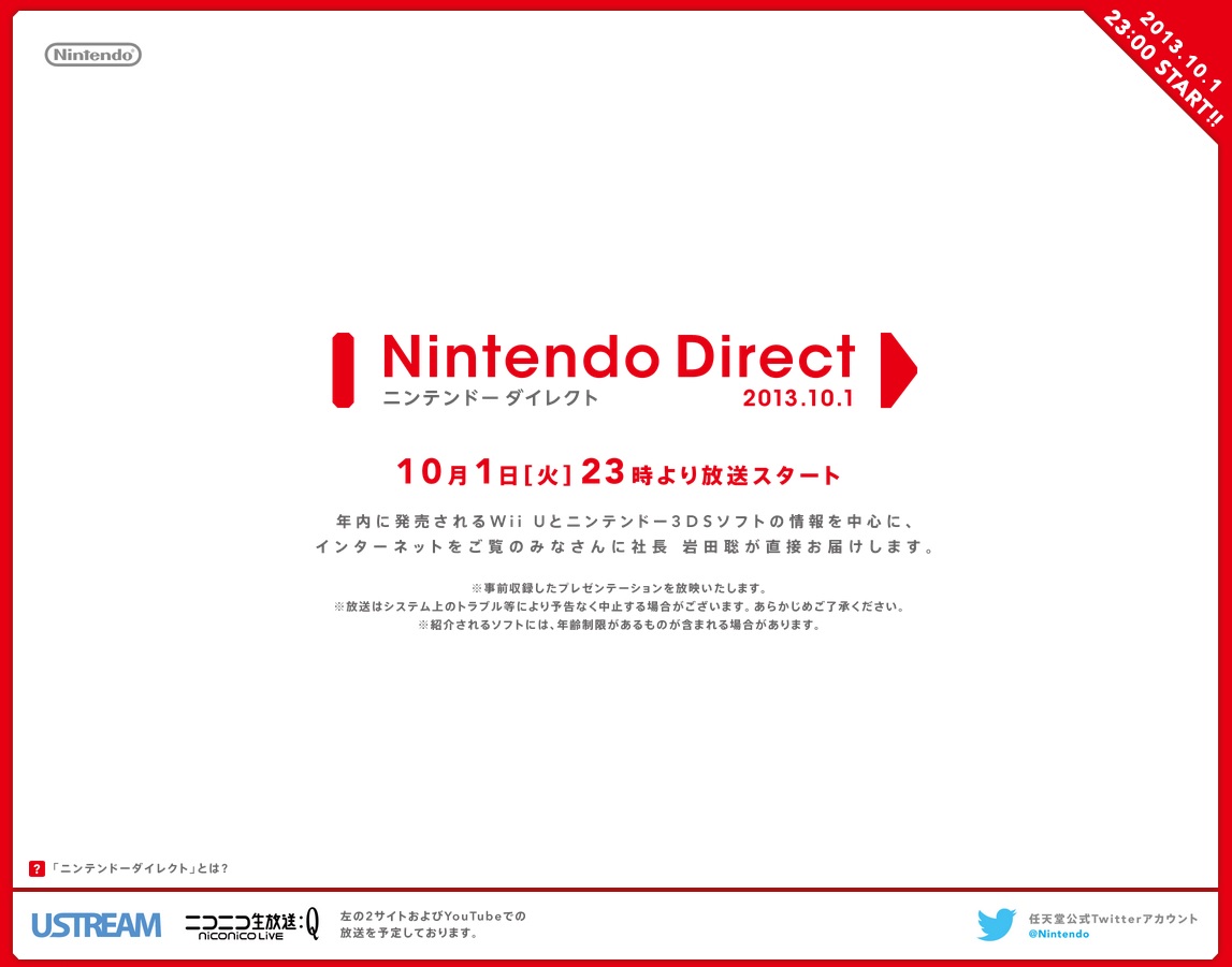 任天堂宣布,將於 10 月 1 日晚間 23:00(台灣時間晚間 22:00)在官方活動網頁、Ustream 與 NICONICO 生放送,由任天堂社長岩田聰帶來最新的「Nintendo Direct 2013.10.1」線上發表會。