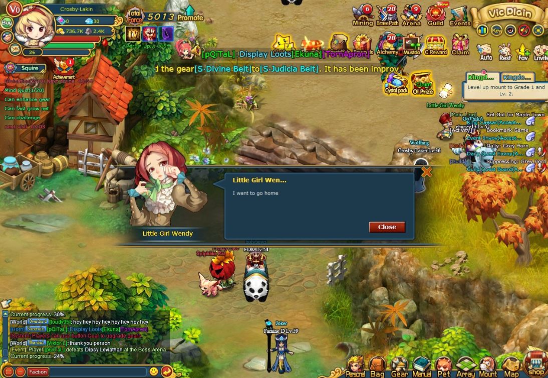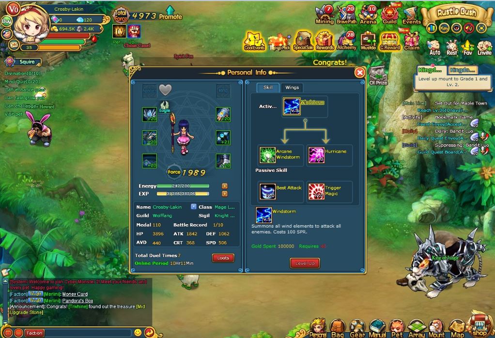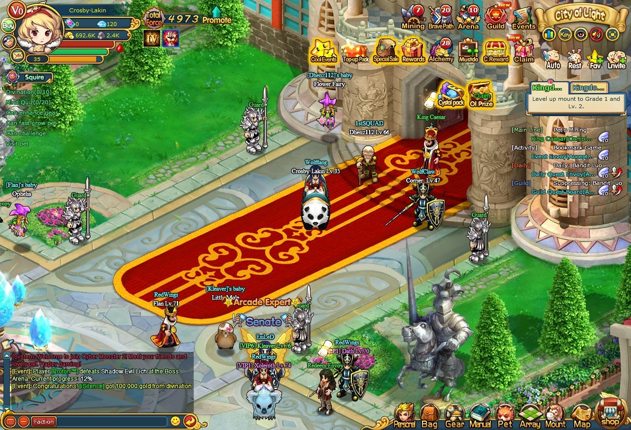 寵物圖鑒中可以看到分成騎士系、惡魔系和精靈系三類,組成了龐大的寵物族譜樹。每隻寵物都有專屬的技能和裝備,讓玩家在安排陣型和戰略時有極高的自由度。根據不同的敵人,玩家每次可以派一隻寵物進入迷失大陸進行戰鬥,若是獲勝將可獲得不同的道具獎勵,而且每隔一段時間還有額外的金錢收益。此外,玩家還可以派駐寵物陣守城鎮防止暴動,放養在公會農場賺取經驗,或者參加「拔蘿蔔」比賽爭取積分排名等。