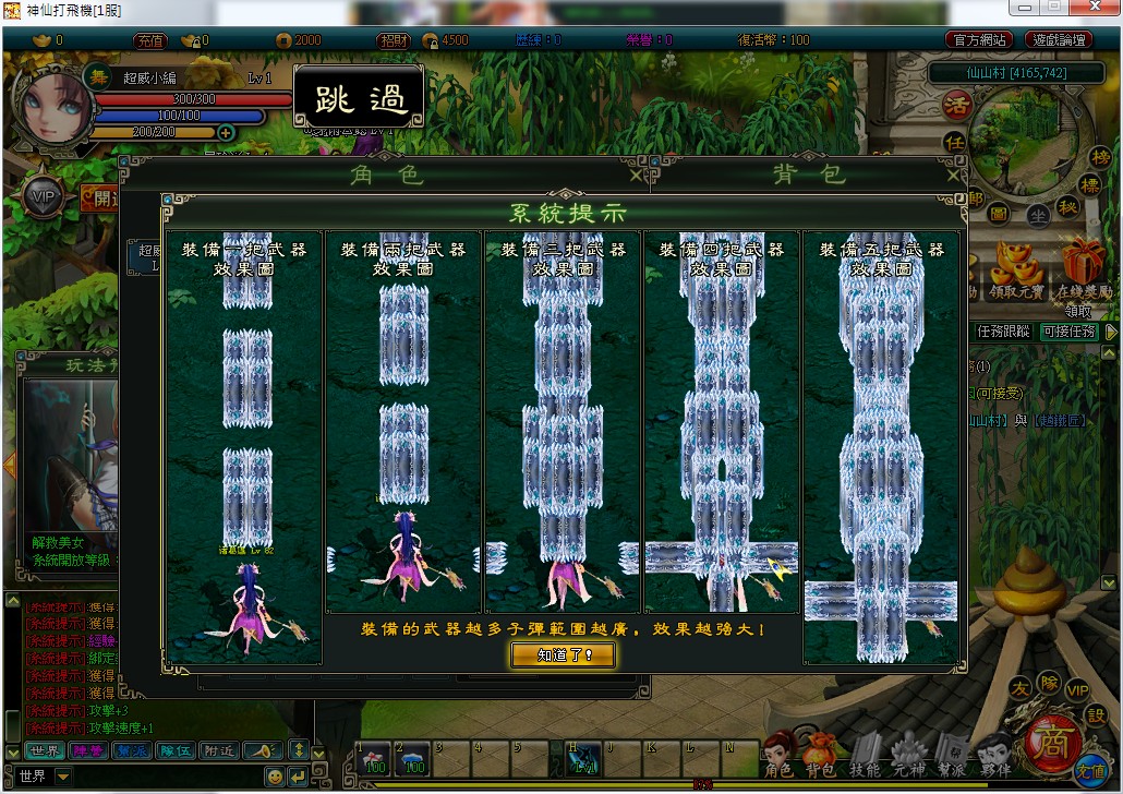 在完成第一個主線任務後,趙鐵匠將會贈送武器作為道謝,連同創建時持有的共兩把武器,將會大大提升攻擊範圍及效果,戰鬥時人物角色裝備武器越多子彈的範圍會越廣將會效果越強大。