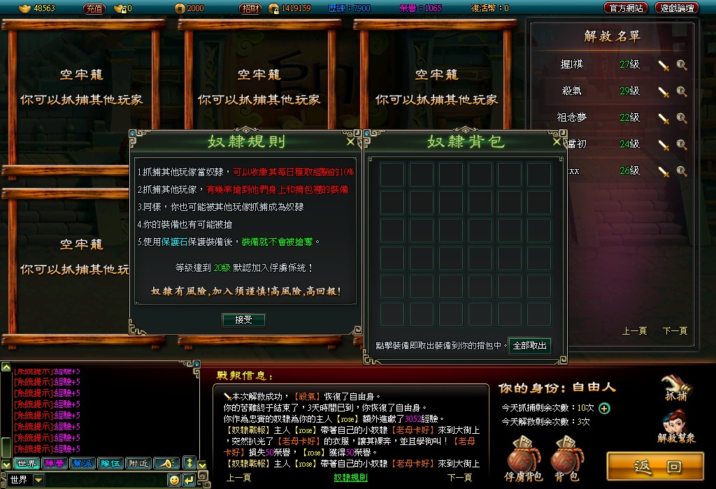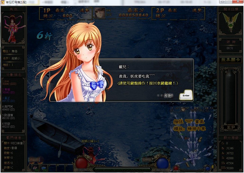 解救美女系統主要考驗玩家的攻擊力以及躲避能力,如果玩家攻擊力不達標,且未在規定時間內戰勝魔王,魔王則會狂化,並釋放超級彈幕,將玩家殺死。每打過一個關卡就會隨機產生一掉落一個寶石碎片,可兌換特殊道具物品。