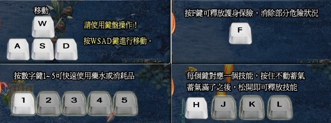技能使用:H、J、K、L 為各職業技能施放鍵,持續按著氣滿放開可釋放該技能。