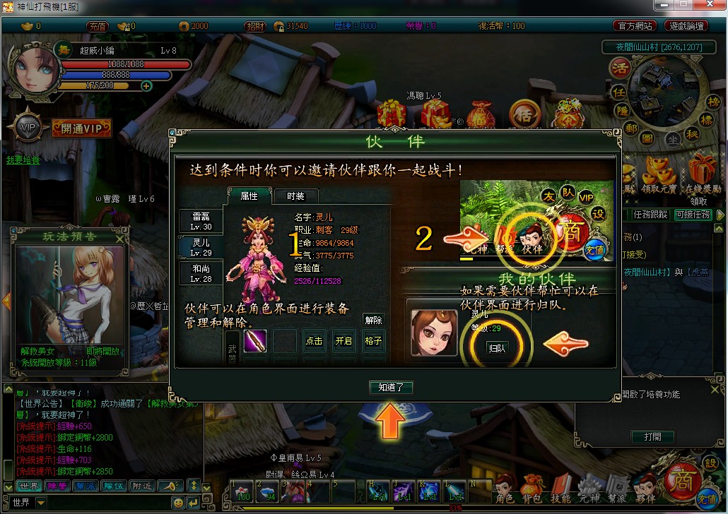 當角色達到 8 級時,可開放伙伴系統,一次可招募兩個伙伴歸隊,夥伴便會加入隊伍出現在角色介面上跟隨玩家,當玩家戰鬥時夥伴會協助玩家進行戰鬥。