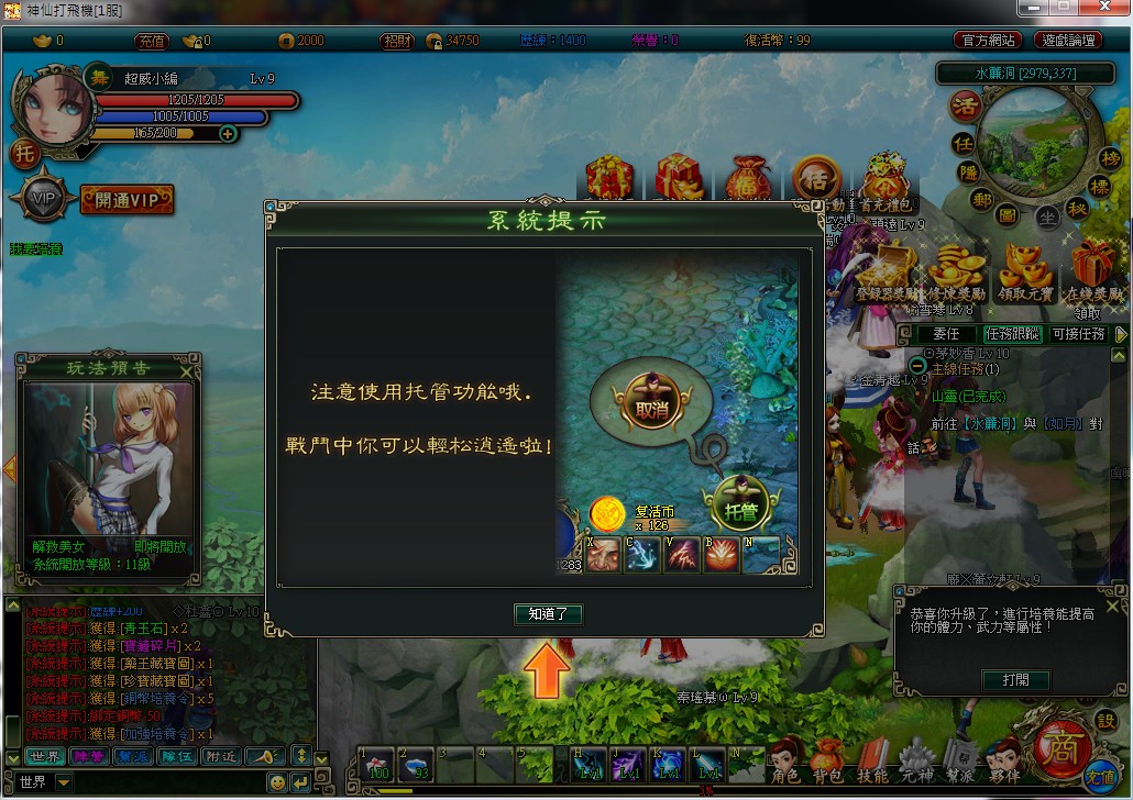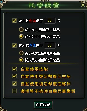 對於無法隨時緊盯電腦的玩家,還可以藉由遊戲中提供的「託管設置」功能進行遊戲。當人物生命或真氣低於一定的量,能設置自動使用藥品、復活幣復活主角及伙伴。