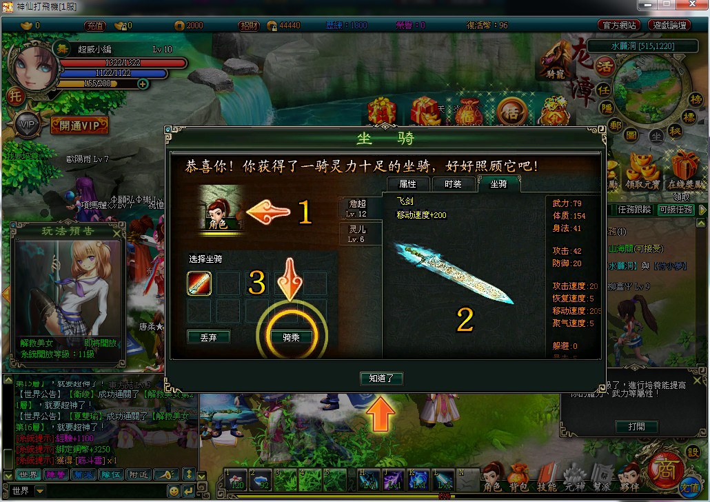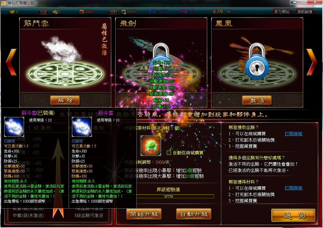 新手時系統贈送永久的筋斗雲坐騎,獲得屬性加成效果