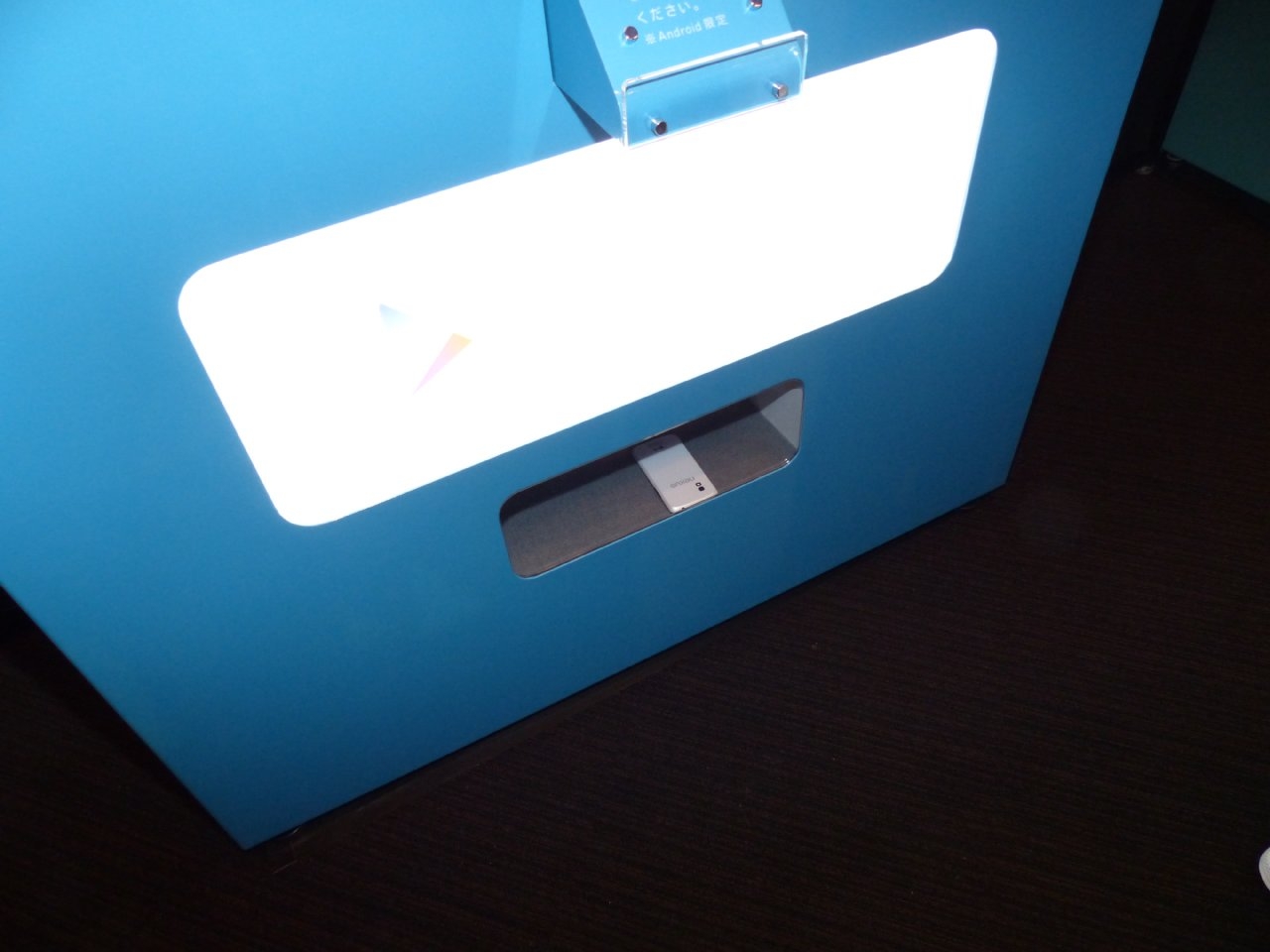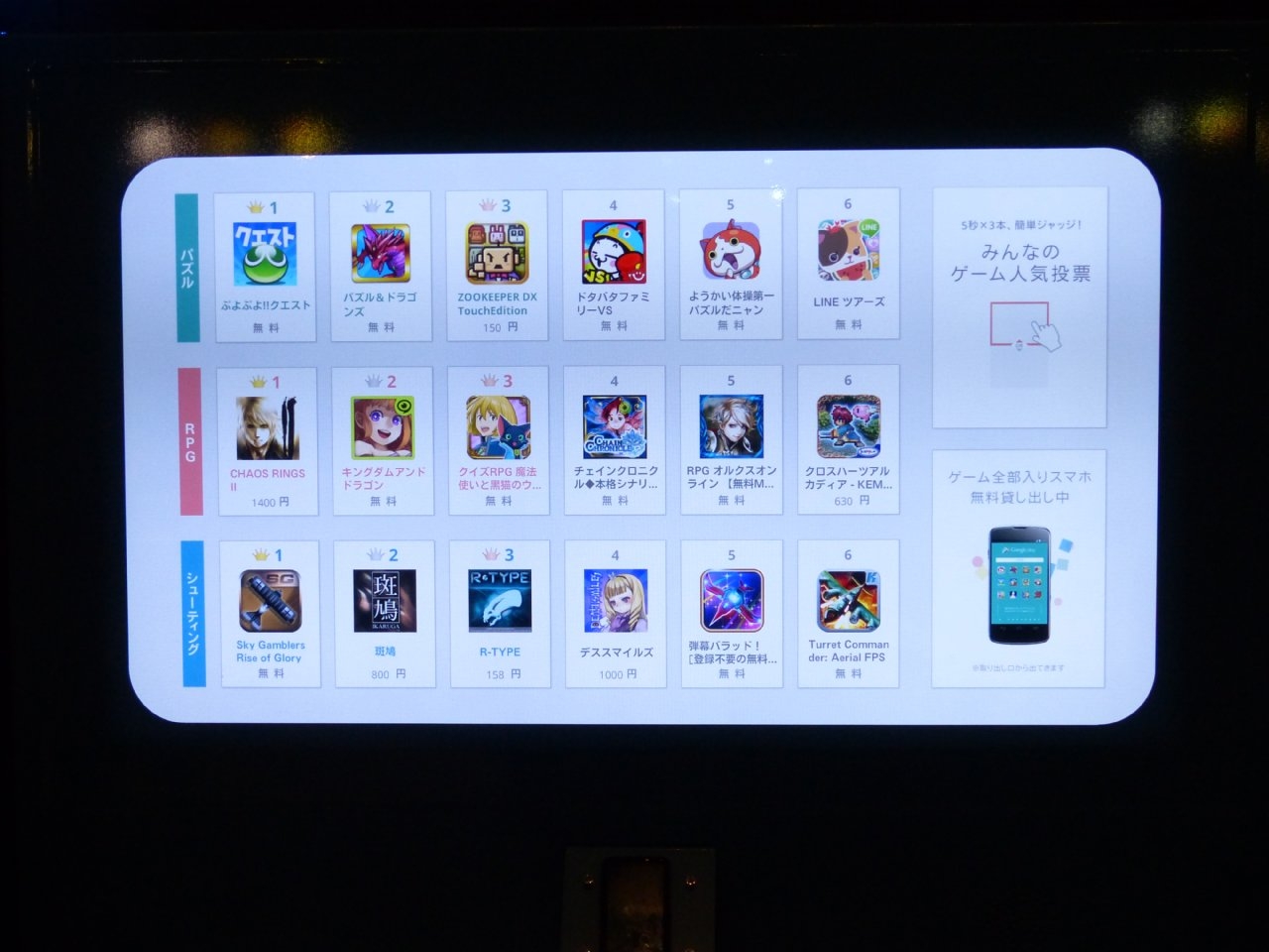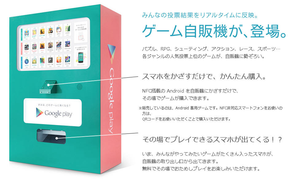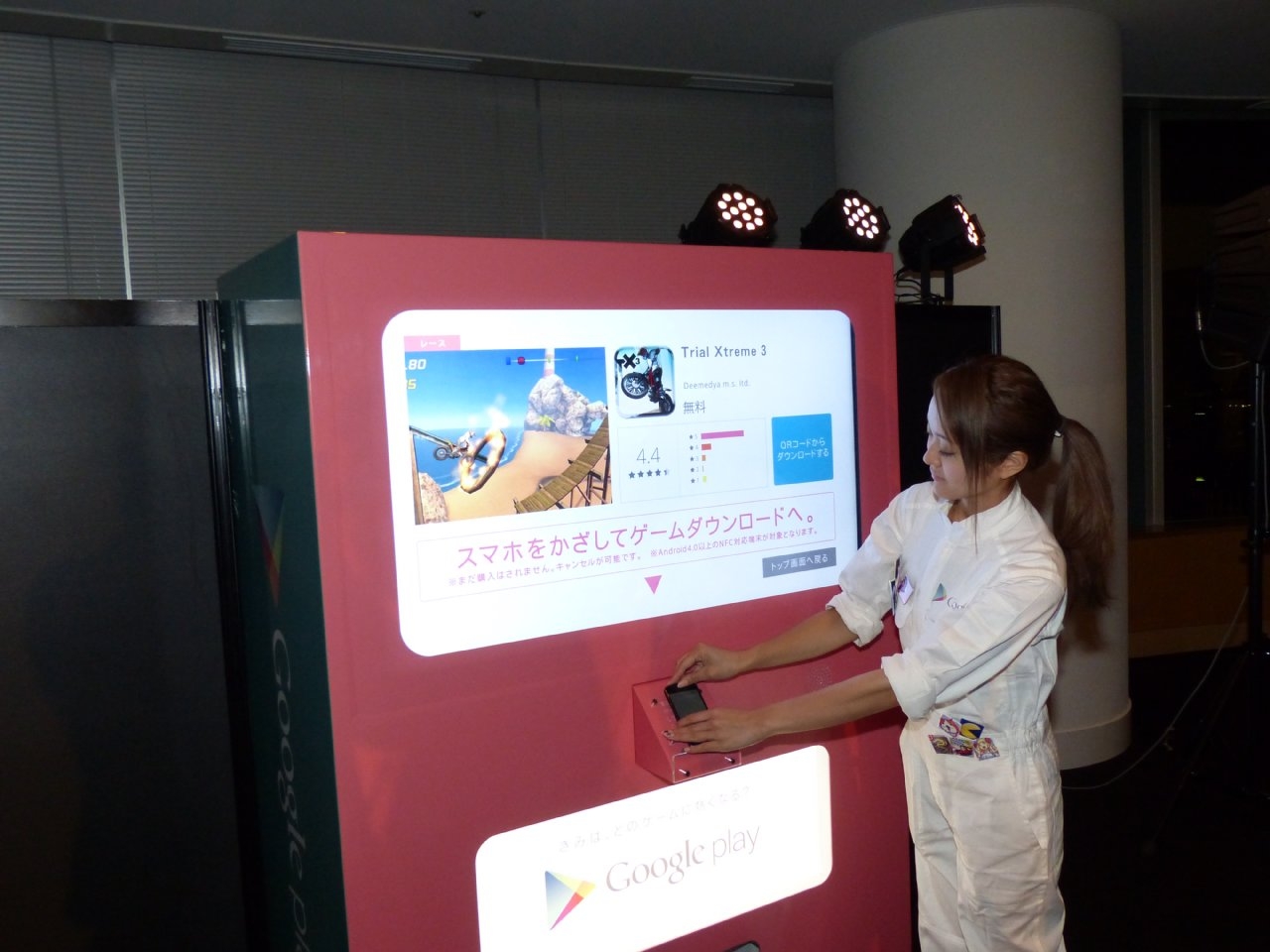 在展示會中設置的自動販賣機上,設有觸碰螢幕跟置放 Android 手機的台子。螢幕中有共區分了 3 種遊戲類型,每種類型分別有 6 款遊戲,總計有 18 款遊戲可供玩家選擇。只要觸碰想要玩的遊戲圖示,並在自動販賣機插上對應 NFC 的 Android 手機,就可購買該應用程式。(沒有對應 NFC 時,只要掃瞄自動販賣機所顯示的 QR 碼即可購入)。