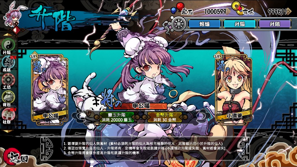 提升品階與魂魄系統在此改版將會推出,而升階仙人以相同種類仙人為素材,提升自身等級,素材的階級不可小於升階仙人,升階後有一定機率失敗,也有一定機率跳躍升階,而透過升階成功的時候的時候可獲得魂魄,每提高一次階級與獲得魂魄都可額外獲得基礎數值。想要要提高你的仙人素質就快去蒐集同種仙人的素材吧。
