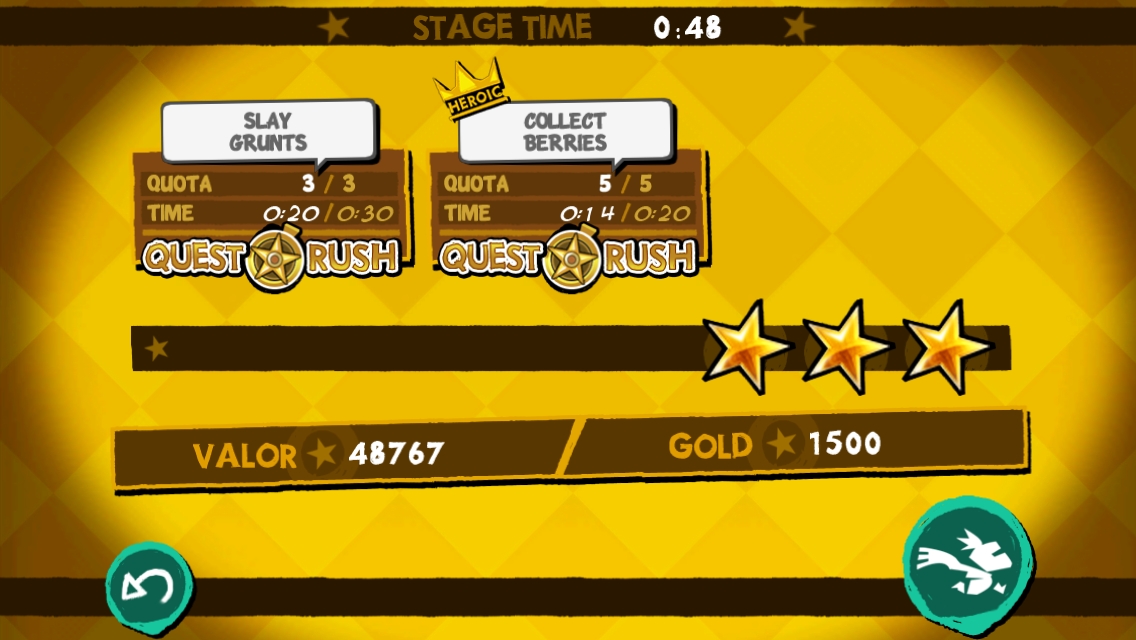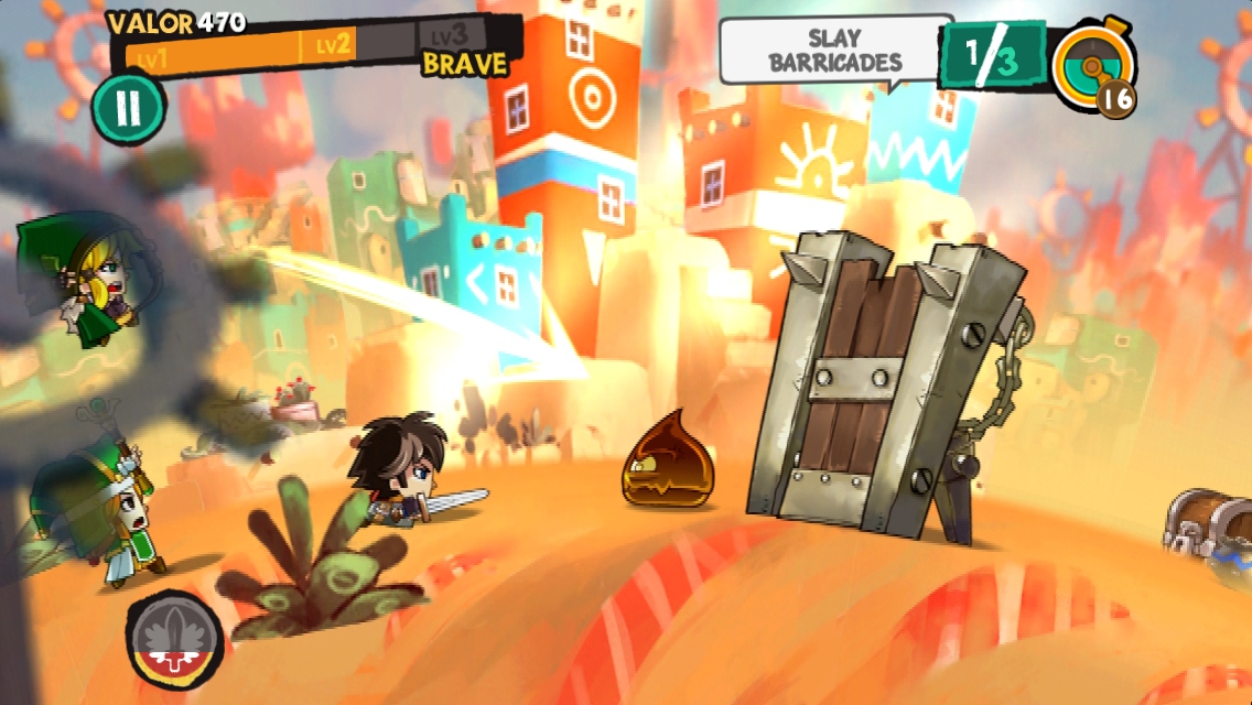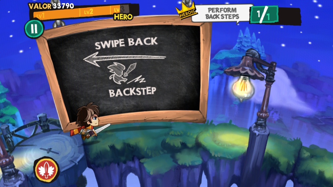 手指上挑是單純的跳躍,下滑則是斬擊,向前橫劃能往前衝刺,向後則是迴避,玩家要視情況切換動作,好避免主角受到路上陷阱或敵兵的損傷。左下角則有類似亢奮的增益效果魔法按鈕,使用後玩家可短時間使攻擊力增加。