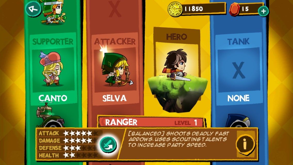各種類英雄玩家只能各選其一而不能組成三補一戰等特殊隊伍,另外每個英雄也可透過消耗金幣升級。除了主角之外,哪些人物作為主力隊員是端看玩家自己的喜好。