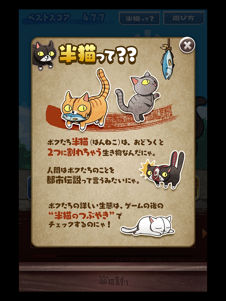 此次遊戲中的主角是一大群可愛但又同時相當詭異的「半貓(はんねこ)」妖怪,他們的身體構造相當不可思議,可以自由的一分為二對半分裂而不見血。但玩家在關卡內的角色卻是其敵對的守護人,要盡可能的抵擋一波波飛躍空中的半貓們,不讓半貓們偷走他們最愛吃的新鮮鲭鱼。
