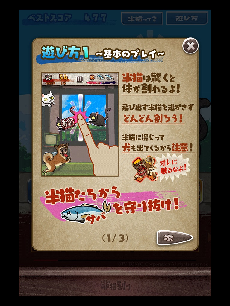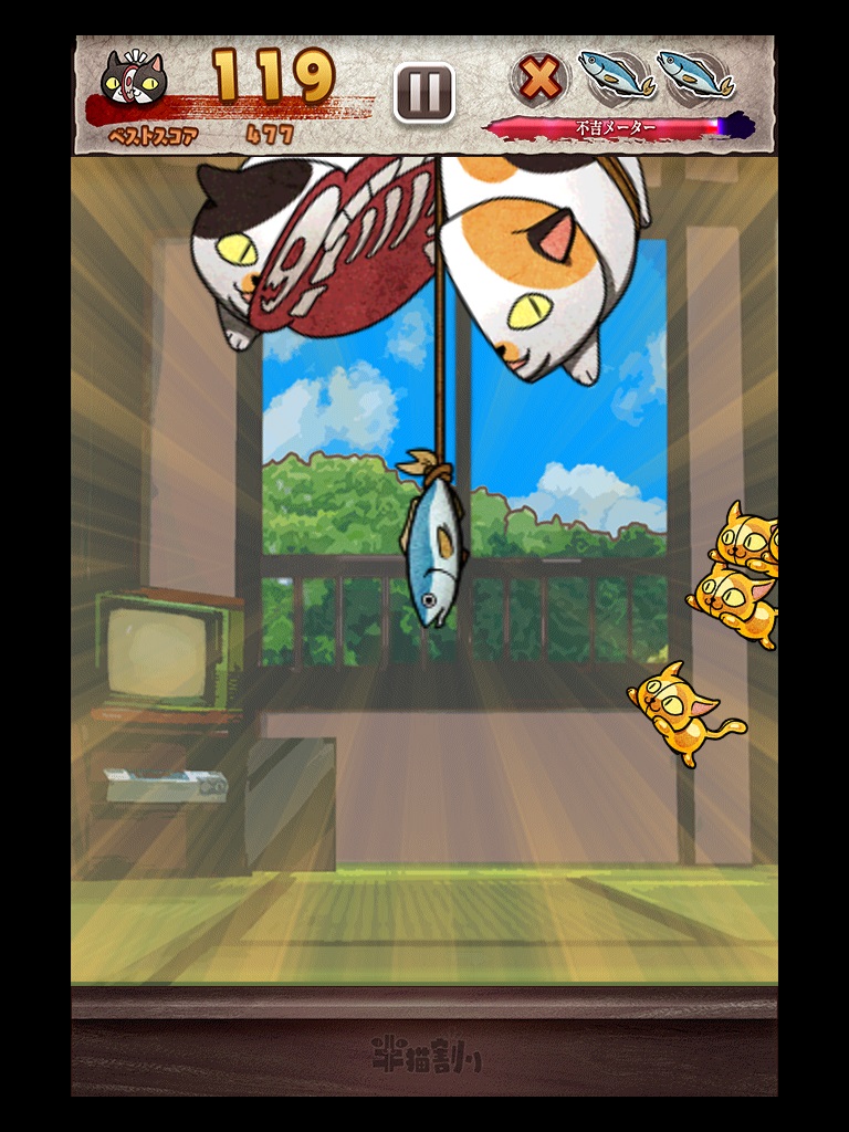遊戲是有些類似《打地鼠》、《水果忍者》的觸控反應類型,在畫面上半貓們會左右不斷的由畫面邊緣跳出,玩家就要眼明手快的點擊目標,使半貓們一分為二阻止他們的行動。右上角會顯示玩家目前擁有的鲭鱼數量,如果失誤再三而使鲭鱼被貓咪們所偷光則就遊戲結束結算積分,當然支撐的越久,消滅的半貓越多則表示成績越佳。