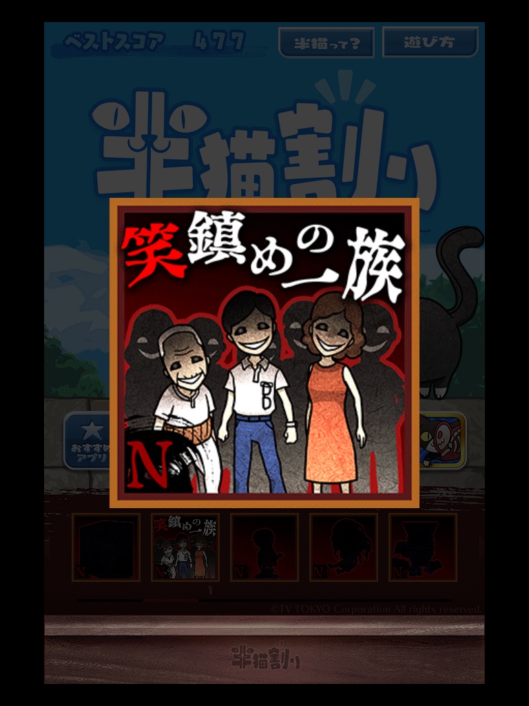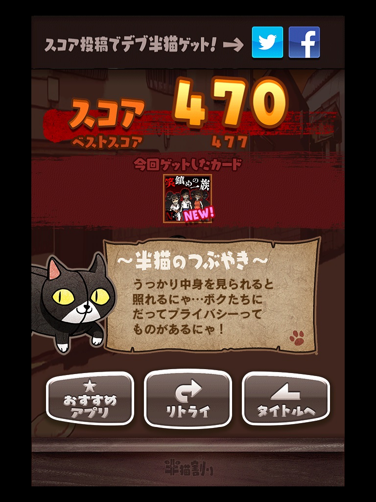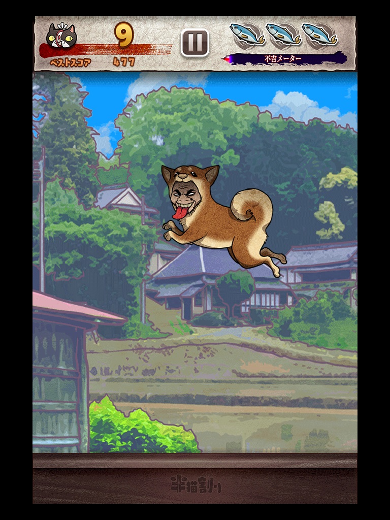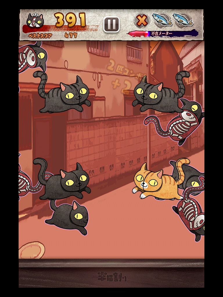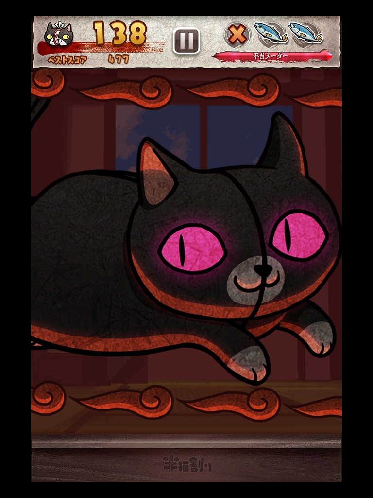 隨著遊戲的進度,右上角會有不吉指數慢慢累積,一但累積的數值額滿則將出現巨大半貓,玩家此時就要快速的手指連打才能將之擊退。