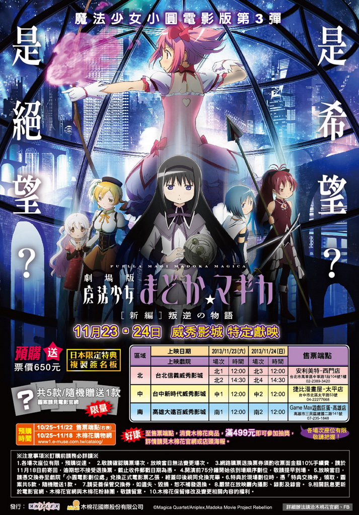 以電視版為基礎製作的《魔法少女小圓》劇場版第三彈《新編 叛逆的物語》日本將於 10 月 26 日上映,而發行商木棉花則將於 11 月 23、24 日在台推出限定場次,並將在本(10)月 25 日開放電影票預購。