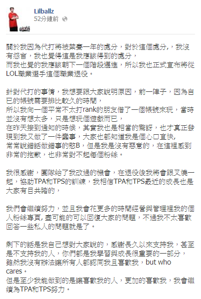 日前,TPA 選手 Lilballz 因代打被禁賽一年,而今日 Lilballz 於粉絲團宣布,將正式從《