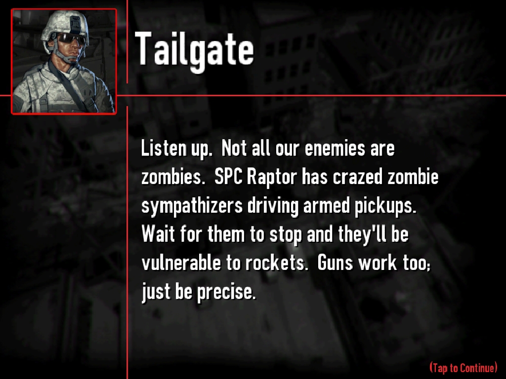 實際作戰採定位移動射擊的配置,在畫面上玩家是乘坐在武裝裝甲越野車移動在街頭,然後到指定位置迎接一波一波的敵人,只要能夠掃蕩街上所有的殭屍就能獲得勝利。