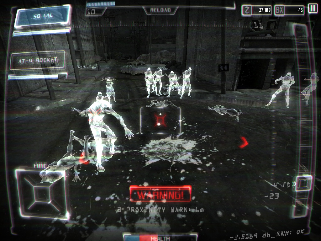 遊戲雖然是定點射擊,但設定上仍是立體 3D 空間之中,也就是說敵人並不是只固定從正前方出現,而是 360 度從前後左右四面八方所湧出,玩家必須適時的依照危險警告快速的滑動視點。