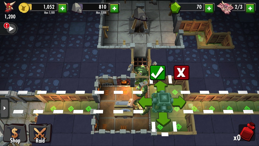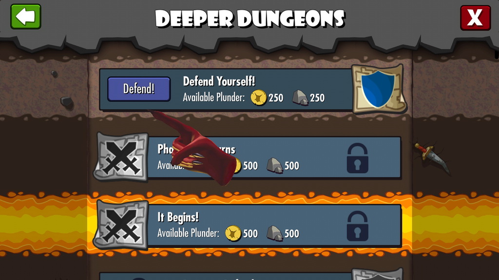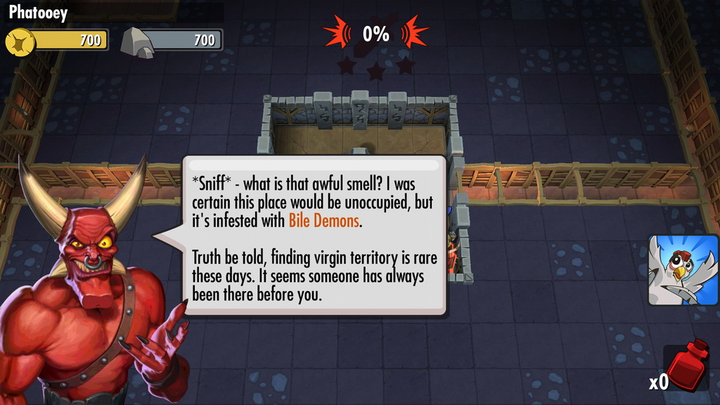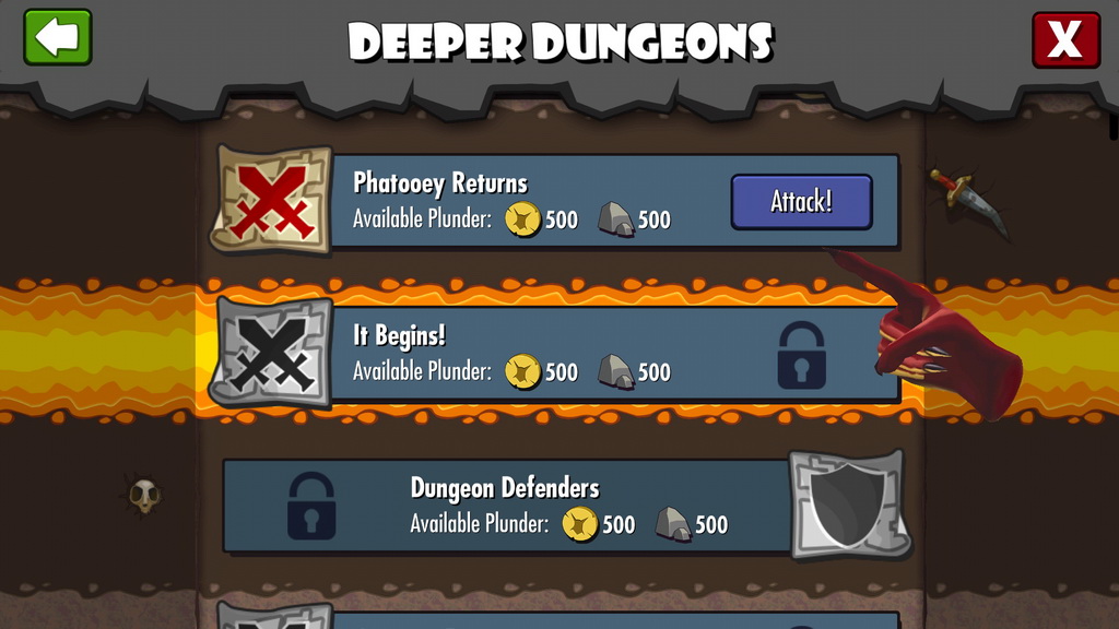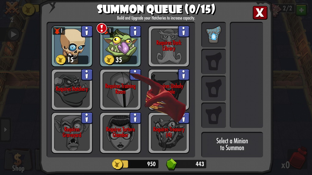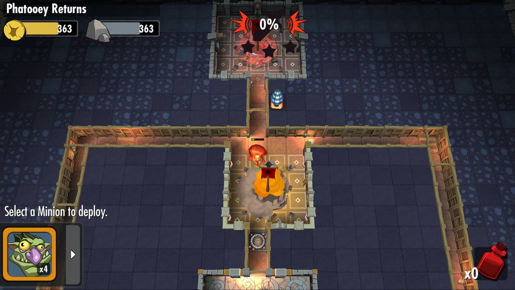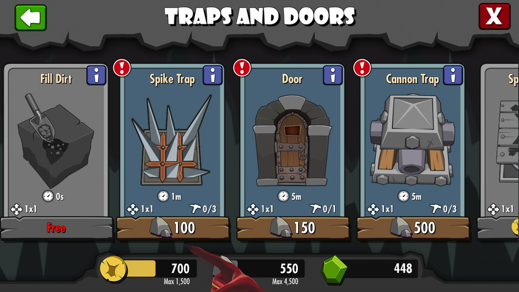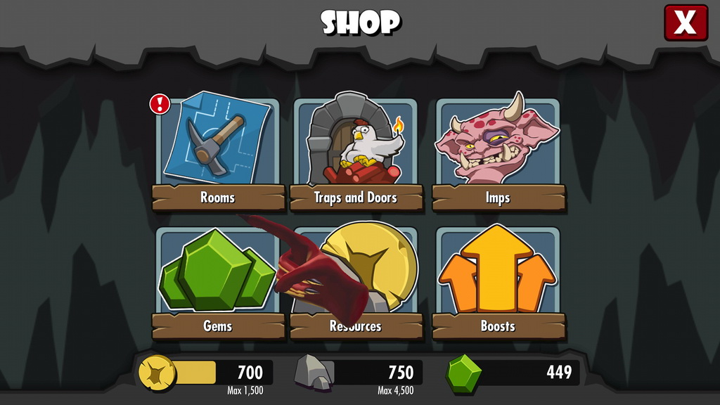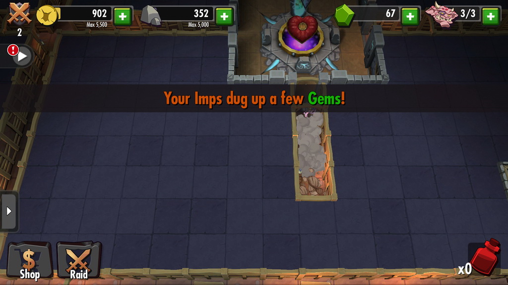 遊戲中挖掘房間的方式相當簡單,玩家只要點選欲挖開的土塊,小惡魔即會自動前來完成使命。但有些強化過的牆壁需要耗費大量的時間挖開,這時玩家就可選擇是否要直接以商城道具加速進行。