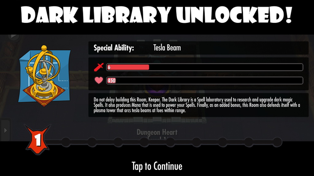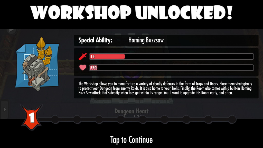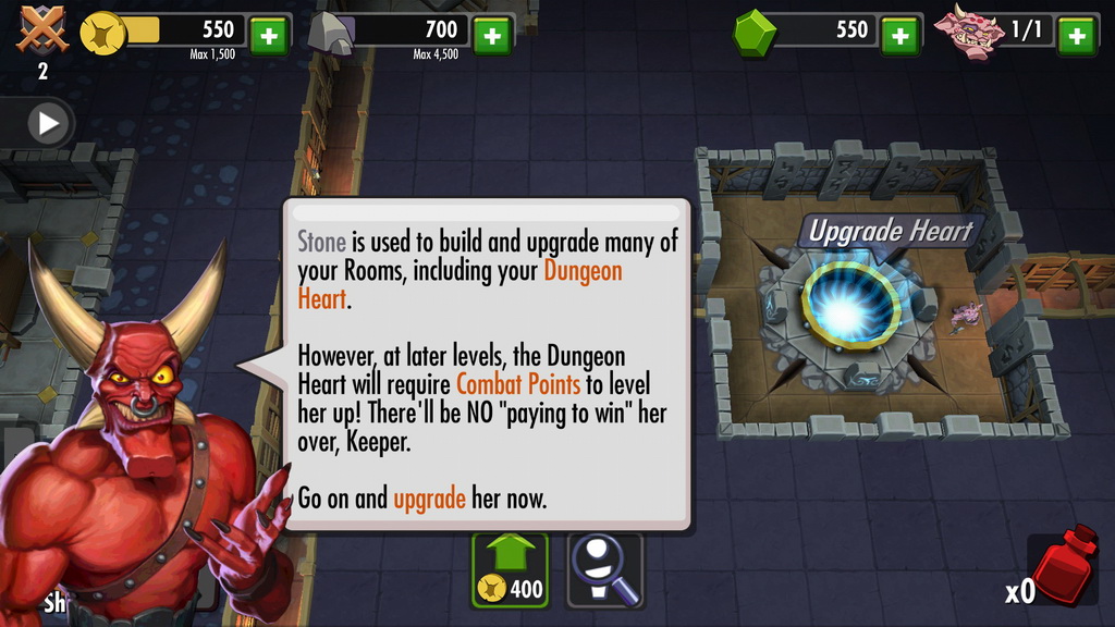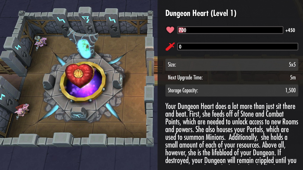 而遊戲中最重要的地城之心,則如同其他房間一般,可以透過匯集各種資源對其進行升級。升級後的地城之心可以讓玩家蓋更多的建築物,許多特殊的建築物與怪物也需要讓地城之心達到一定的等級才可解鎖。