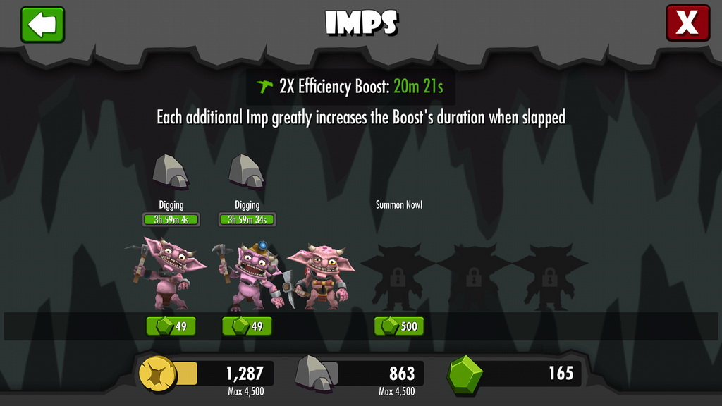 保留了系列作的傳統,身為大魔王的玩家依然可以給最低階的小惡魔來個愛的巴掌,增加其工作效率。只要進入到小惡魔的招喚頁面,玩家即可透過手指橫畫的方式來毆打他們,使其在一定時間內增加兩倍的工作效率。