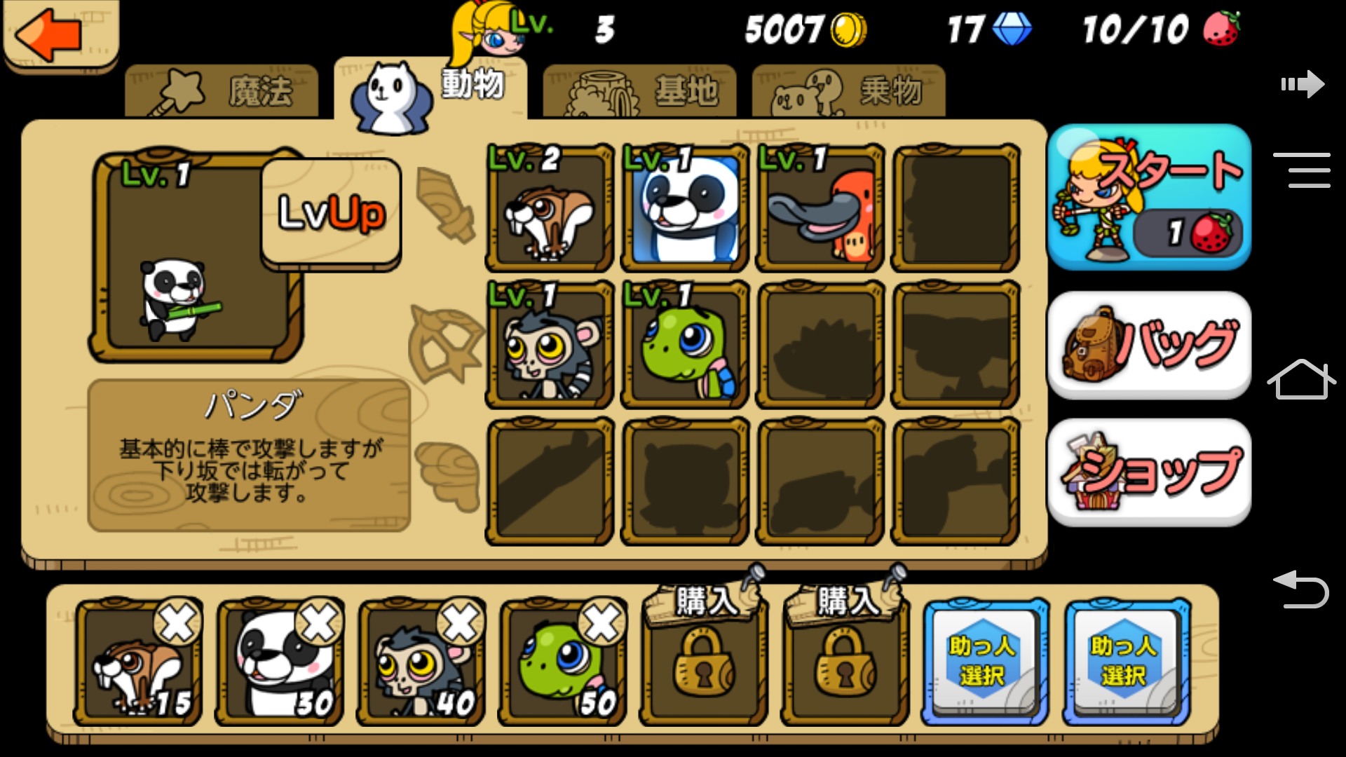 雖然也想跟動物的強化並行,但要讓所有都動物到達最大等級的話,就資源來說比較嚴苛。另外還有所謂的骰子關卡,在這種關卡中可召喚的動物都是隨機的,所以在強化費用還算便宜的時候就先平均強化,之後再選擇適合自己玩法的動物來提升等級會比較理想吧。就營運團隊的推薦的話,在遊戲初期似乎先強化松鼠會比較好一點。