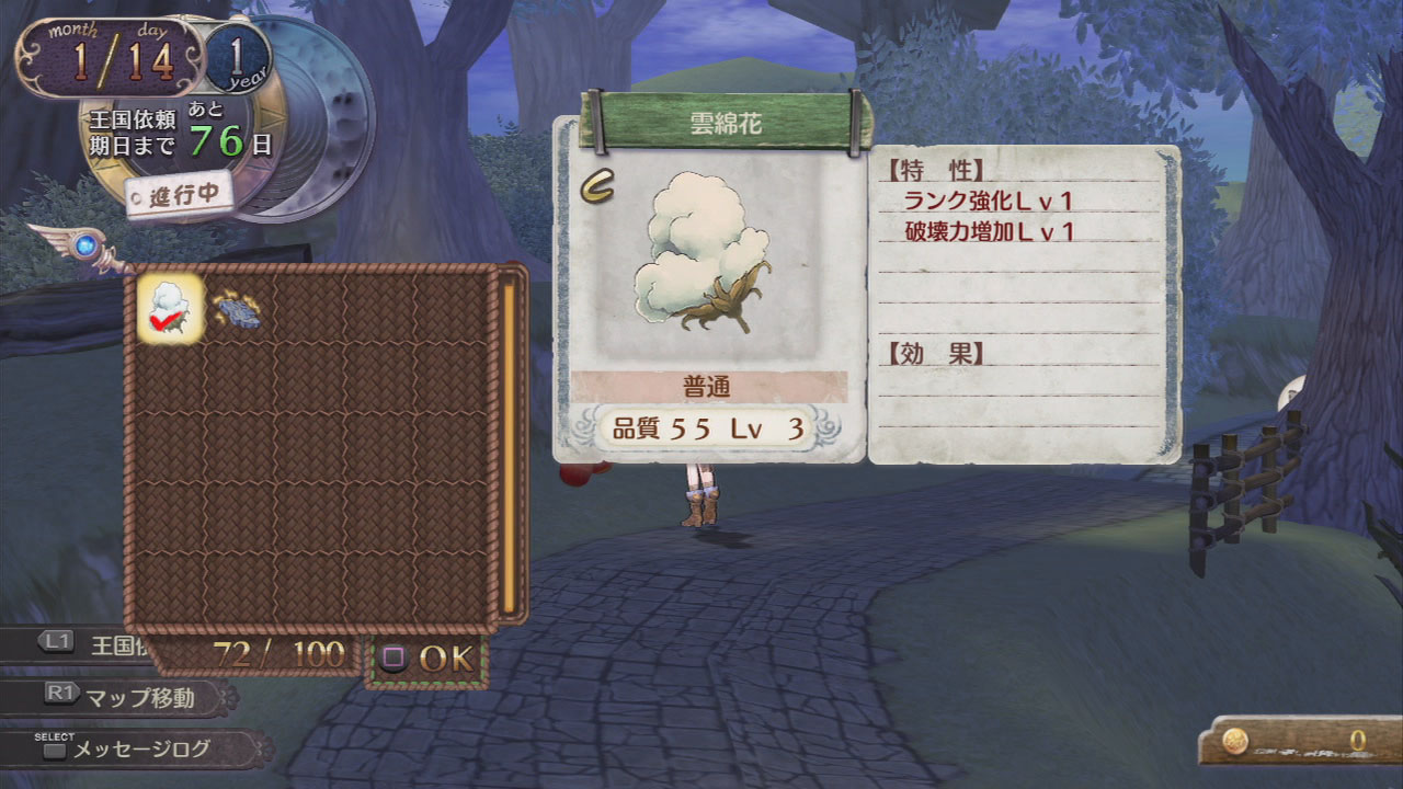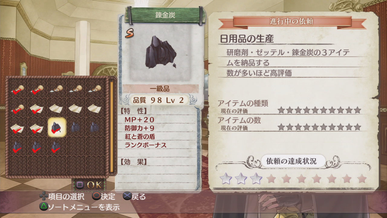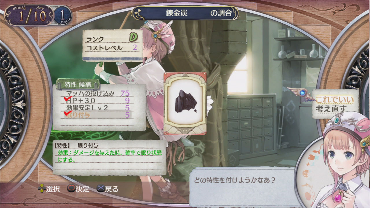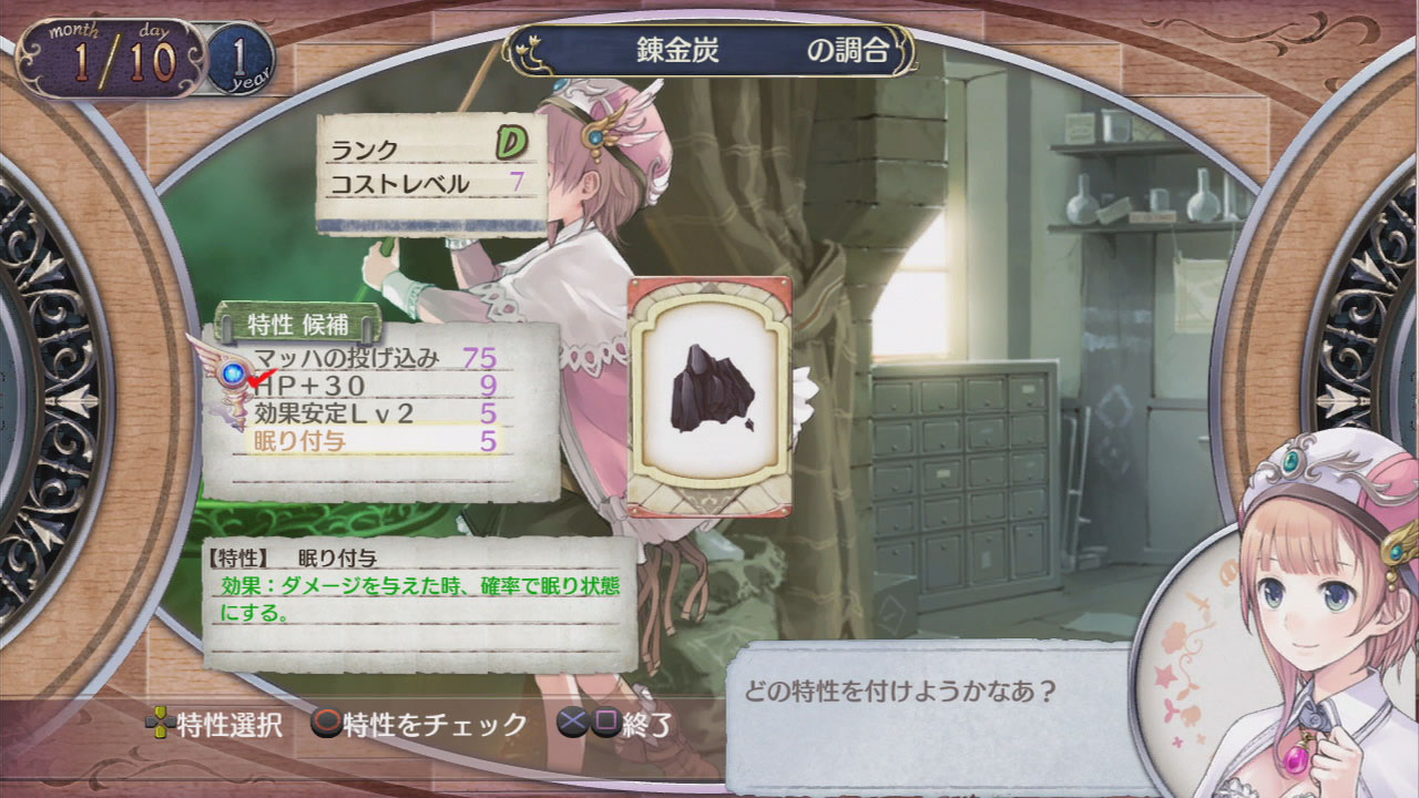 調合出來的道具有代價LV有多少,就可加上符合的特性,本作也增加了讓2種特性組合出效果更高特性的新調合要素!