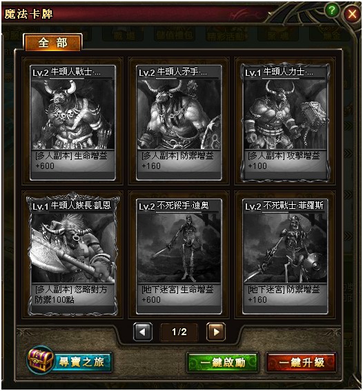 卡牌可通過尋寶之旅收集,兩張相同的卡牌可進行升級並提升對應的屬性;尋寶之旅系統主要產出為卡牌,各階層卡牌都有幾率找到。該系統每6小時(離線也算)增加一次尋寶機會,次數上限為10次。