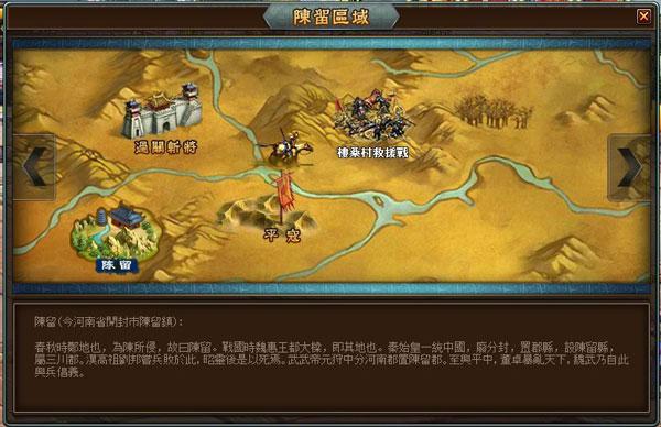 根據介面出現的新手指示打開「陳留區域」介面後,玩家點選任務所在地標,便可進入「陳留戰場」體驗遊戲的戰鬥系統。《