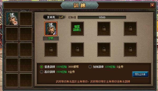進入武將訓練面板,玩家可選擇需要培訓的武將及訓練的模式後,便可點選「開始訓練」按鈕進行武將訓練,提升武將等級。和裝備強化類似,訓練武將也需要一定的冷卻時間,如果玩家想要同時訓練多個武將,則需花費金券開拓訓練位,金券可從後期開啟的各種新玩法中獲得。