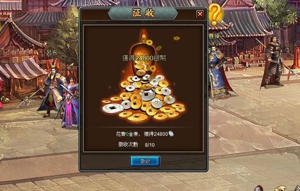 努力通關的過程中,系統在角色達到 LV13 時開啟了新玩法「徵收」,玩家每天有十次徵收機會,可不費分文收取大量銀幣,如使用金幣進行徵收,則可獲得更龐大的財富。