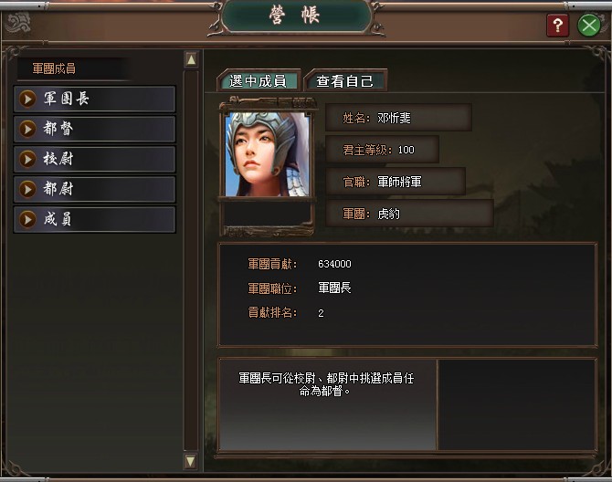 軍團營帳擁有機密的軍團成員資料,可查看軍團成員的軍團貢獻、軍團職務等訊息。軍團職務主要分成軍團長、都督、校尉、都尉與平民。軍團長為軍團創建者,都督由軍團長從校尉、都尉中挑選,軍團長與都督可開啟關卡爭奪戰,此外,不同職務於庫房內可兌換之貢獻獎勵也將有所差異。