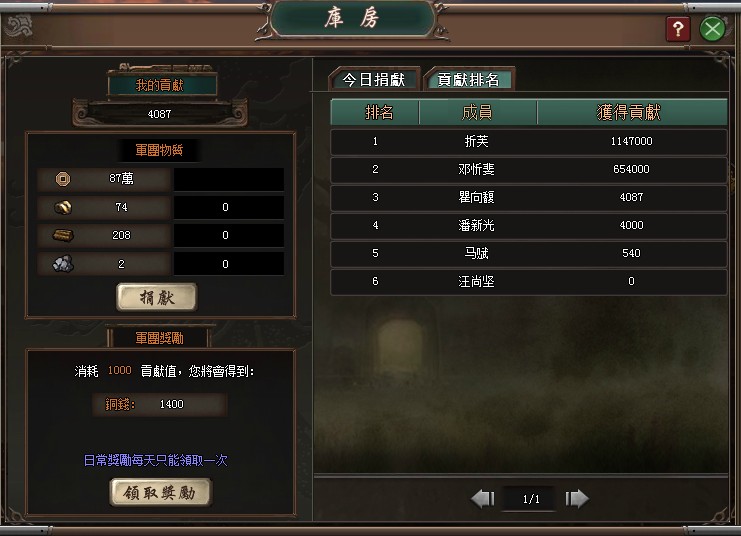 庫房維繫軍團命脈,在此可查看當前軍團物資,並捐獻銅錢、銅礦、原木、石頭,以提高自身對軍團的貢獻。個人貢獻值將可消耗換取銅錢,軍團物資將影響研發所的科技進程,故聚沙成塔、團結齊心將讓軍團更加蓬勃發展。