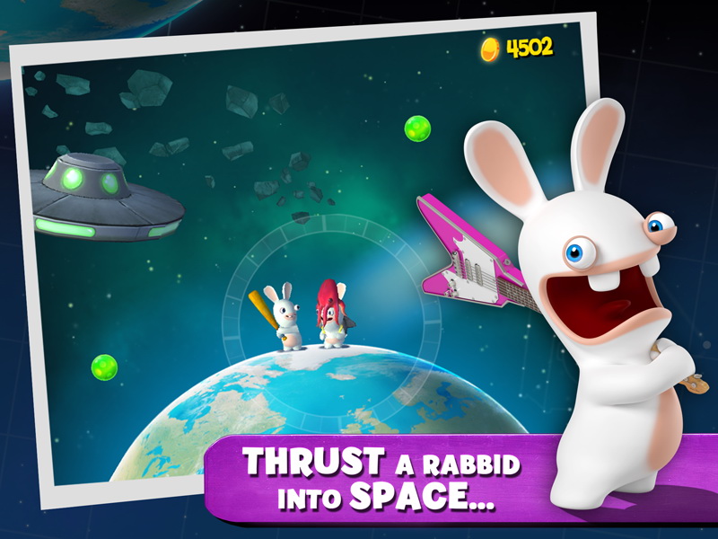 遊戲內的自訂選項包含了噴射背包升級、帶來更快的速度或是火焰效果,以及各式各樣逗趣好玩的外觀配件能讓瘋狂兔子脫穎而出,還得小心瞬息萬變的太空環境以及包含太空鴨與起司星球等角色,一起隨著瘋狂兔子抓狂尖叫。